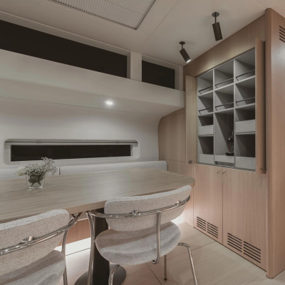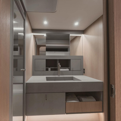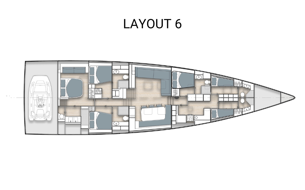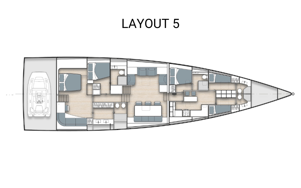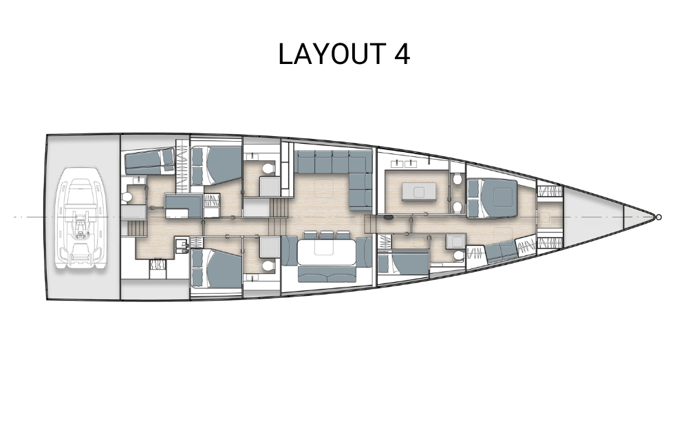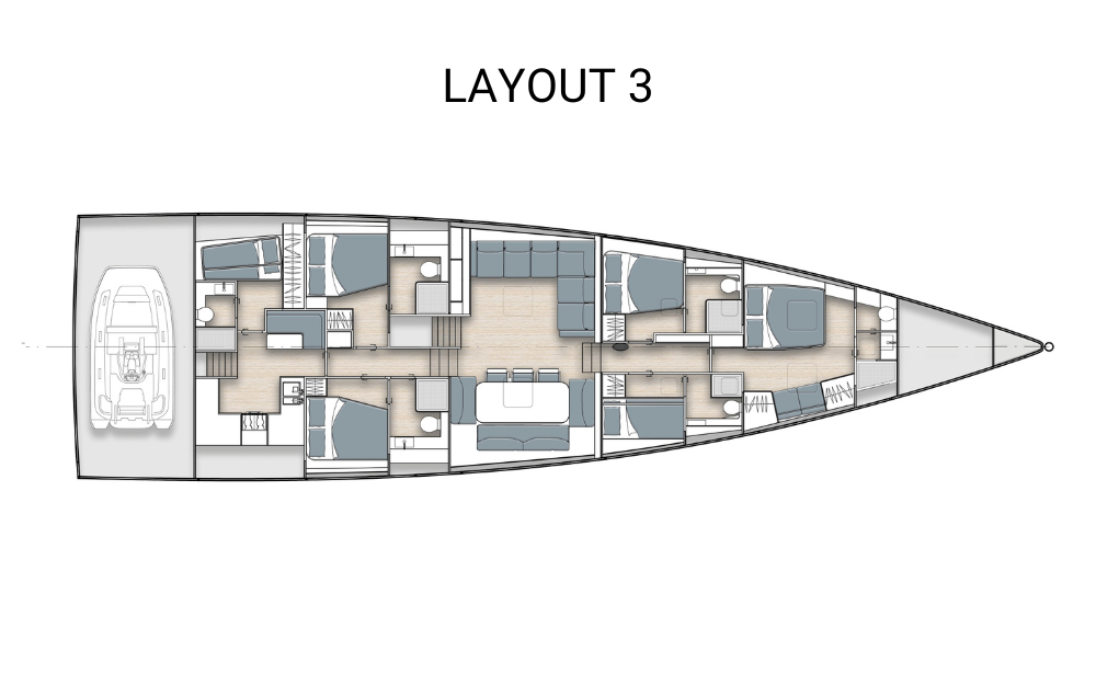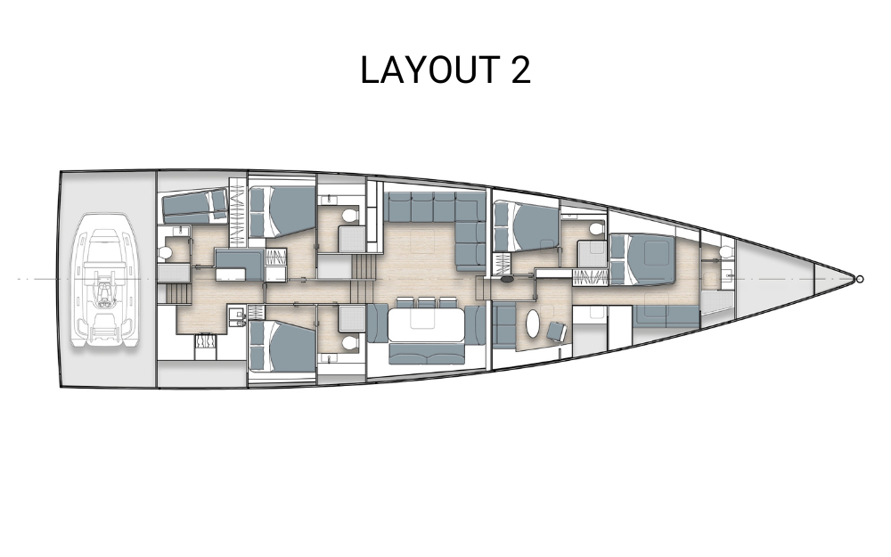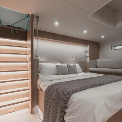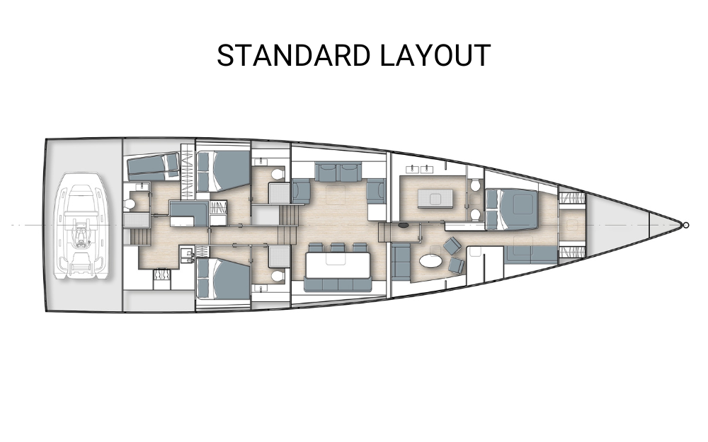 Gracias a nuestra construcción modular, la distribución puede adaptarse a los deseos del propietario. Por ejemplo, es posible ubicar la cabina del armador en proa o en popa, y se puede elegir el número de camarotes de invitados (hasta 4), lo cual es excepcional en esta clase.