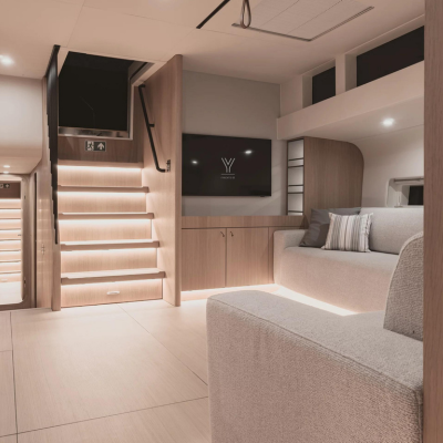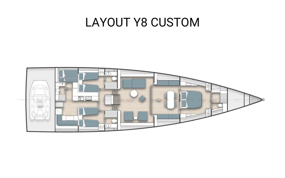 El volumen interior del velero Y8 ahora es un 20 por ciento más grande que el de sus predecesores como «Cool Breeze», «Makai» o «Vegas Baby», lo que abre la posibilidad de crear aún más opciones de distribución. Por ejemplo, el Y8 es la única embarcación en su categoría que ofrece la posibilidad de obtener un diseño con 4 amplios camarotes dobles. Al ubicar la sala de máquinas bajo el suelo del salón, el yate tiene un centro de gravedad más bajo y, por lo tanto, un mejor equilibrio, lo que se traduce en velocidad adicional.