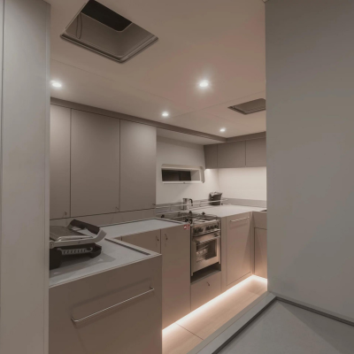 Existen numerosas opciones para dividir el Y7 debajo de la cubierta que se adaptarán perfectamente a sus necesidades, dependiendo de si acostumbra a navegar sólo o con tripulación, o si prefiere una cocina abierta a una cerrada en su yate.